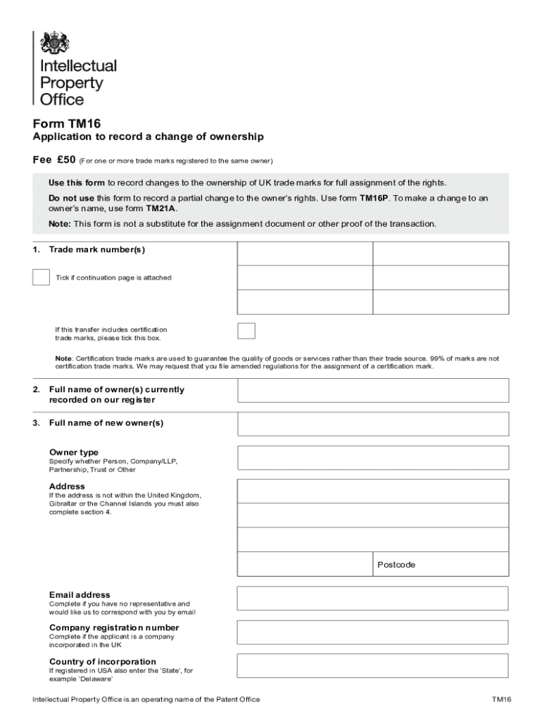 Form TM16Application to record a change of ownership