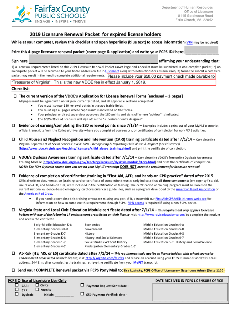 Department of Human Resources Office of Licensure 8115 Gatehouse Road Falls Church, VA 220422019 Licensure Renewal Packet for expired license holders While at your computer, review this checklist