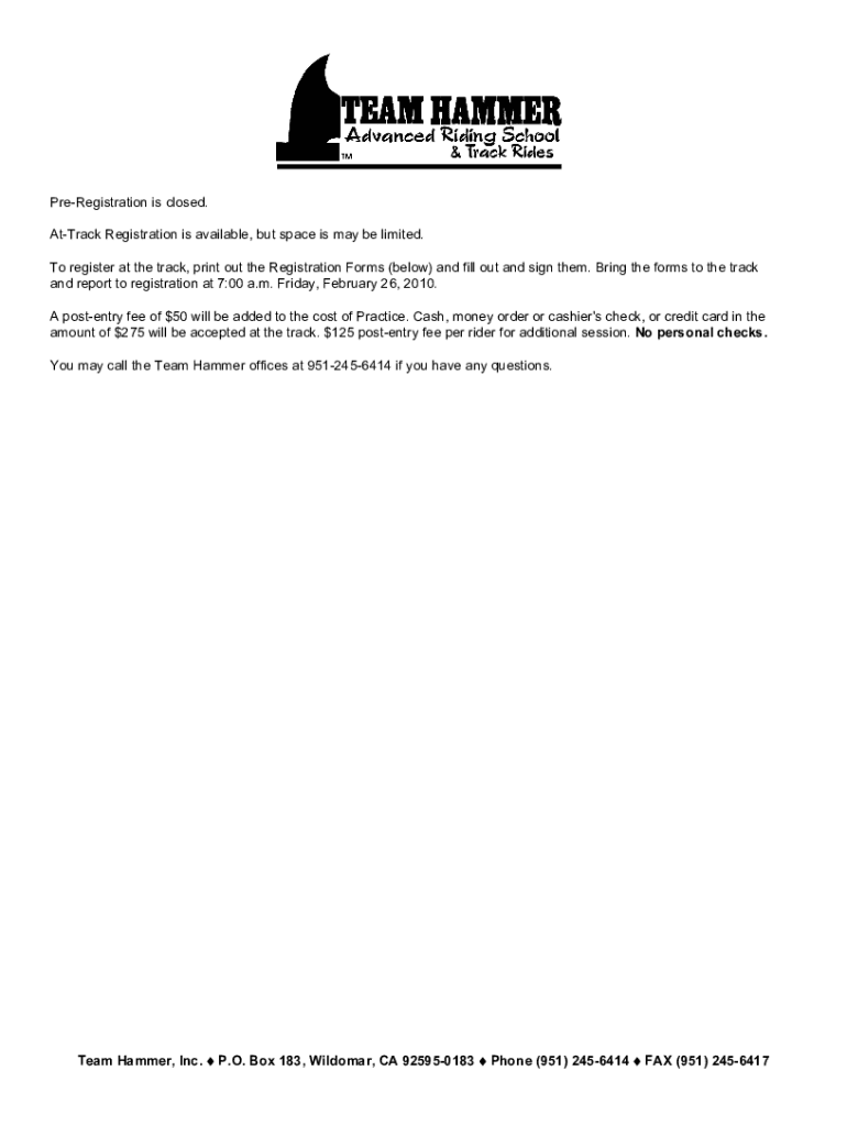 To register at the track, print out the Registration Forms (below) and fill out and sign them. Bring the forms