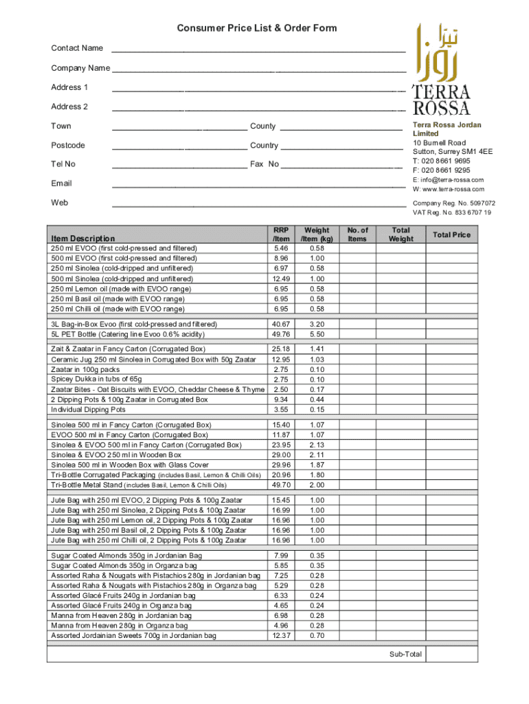 Consumer Price List & Order Form Contact Name Company Name Address 1 Address 2 Town County Postcode Country Tel No Fax No Email E: info terrarossa.com W: www.terrarossa.comWeb Company Reg. No. 5097072