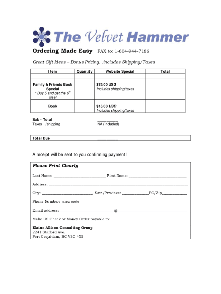 Ordering Made Easy FAX to: 16049447186Great Gift Ideas Bonus Pricing includes Shipping/Taxes ItemQuantityWebsite SpecialFamily & Friends Book Special * Buy 5 and get the 6th free!$75.00 USD Includes