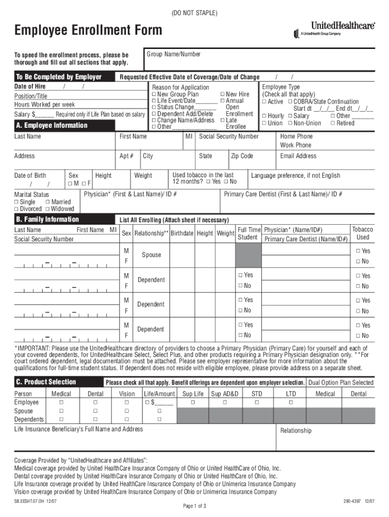 (DO NOT STAPLE)Employee Enrollment Form Group Name/Humberto speed the enrollment process, please be thorough and fill out all sections that apply. Group To Became Completed by Employer Date of Hire