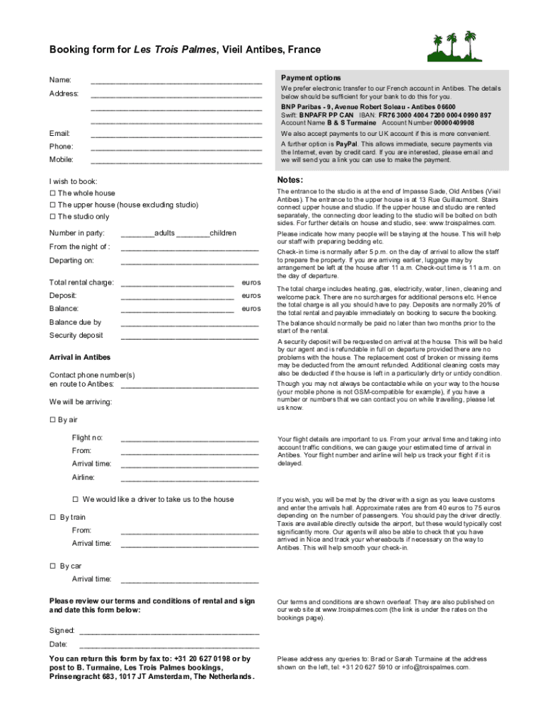 Booking form for Les Trios Palmer, Vial Antigen, France Name: Payment optionsAddress: We prefer electronic transfer to our French account in Antigen. The details below should be sufficient for your