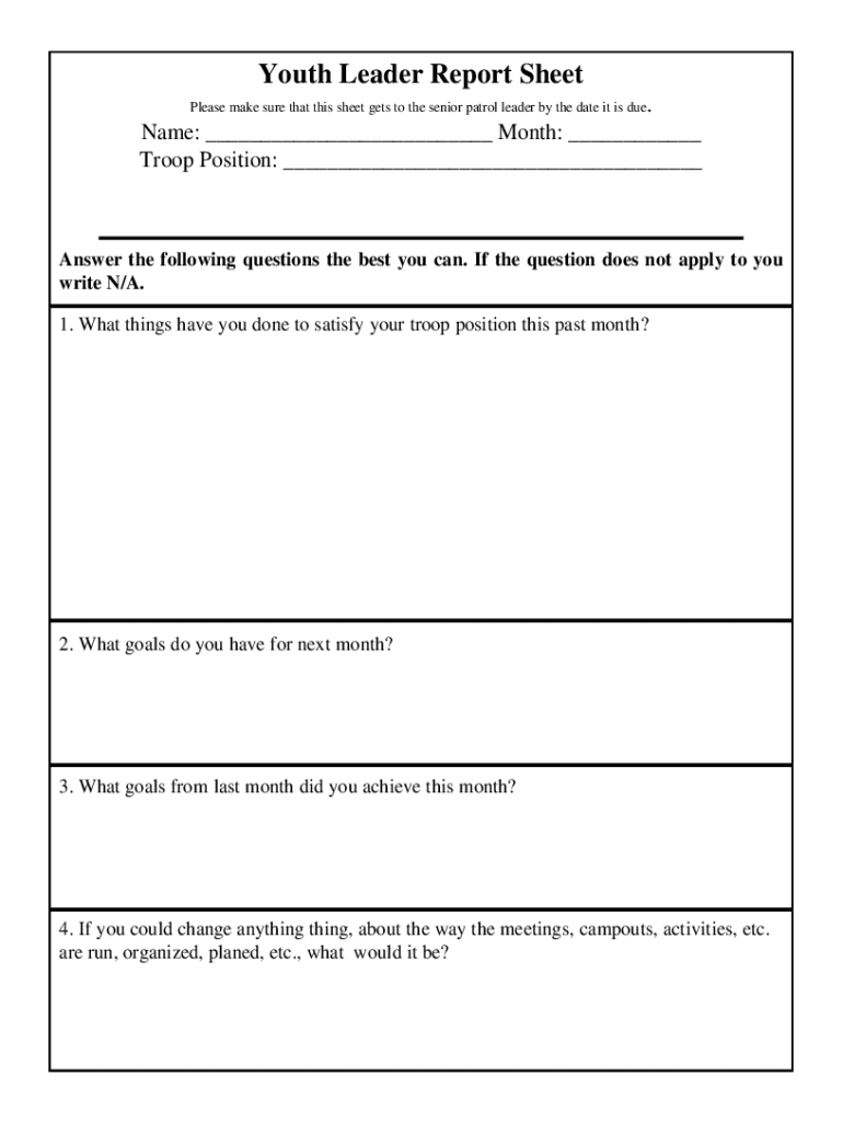 Youth Leader Report Sheet Please make sure that this sheet gets to the senior patrol leader by the date it is due. Name: Month: Troop Position: Answer the following questions the best you can. If