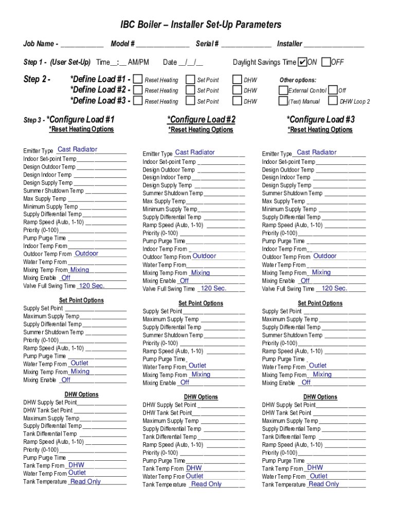 IBC Boiler Installer SetUp Parameters Job Name Model # Serial # Installer Step 1 (User SetUp) Time : AM/Step 2 *Define Load #1 *Define Load #2 *Define Load #3 Step 3 *Configure Load #1 *Reset Heating