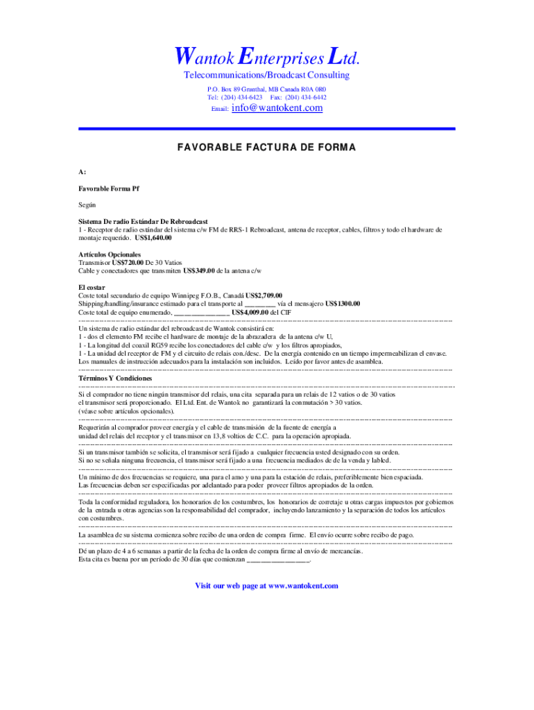 Wanton Enterprises Ltd. Telecommunications/Broadcast Consulting P.O. Box 89 Orenthal, MB Canada R0A 0R0 Tel: (204) 4346423 Fax: (204) 4346442 Email:info cantonment. Comfortable FACT URA DE FORM A: