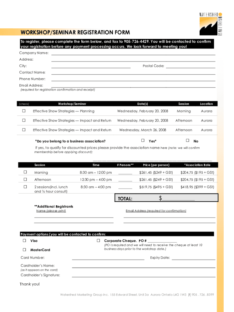 WORKSHOP/SEMINAR REGISTRATION FORM To register, please complete the form below, and fax to 9057264429. You will be contacted to confirm your registration before any payment processing occurs. We look