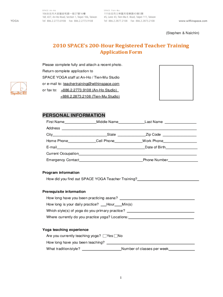 (Stephen & Niacin)2010 Spaces 200Hour Registered Teacher Training Application Form Please complete fully and attach a recent photo. Return complete application to SPACE YOGA staff at AHO / Taint Studio