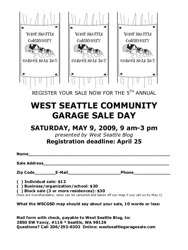 REGISTER YOUR SALE NOW FOR THE 5TH ANNUALS SEATTLE COMMUNITY GARAGE SALE DAY SATURDAY, MAY 9, 2009, 9 am3 pm presented by West Seattle BlogRegistration deadline: April 25 Name Sale Address Zip Code