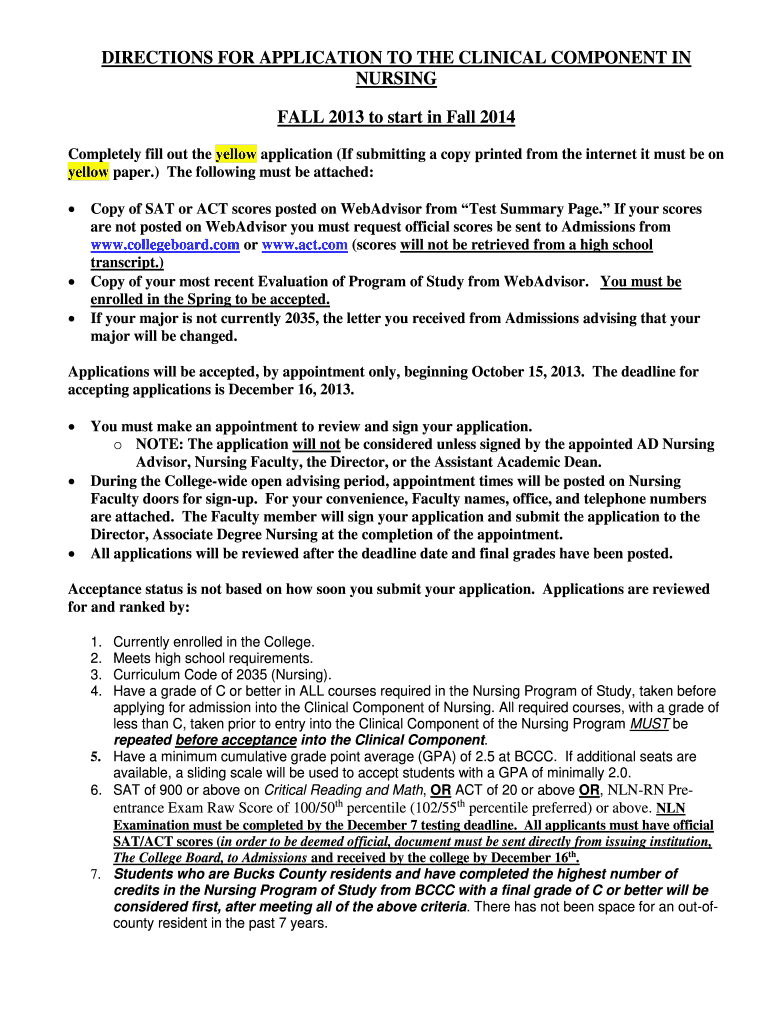 DIRECTIONS FOR APPLICATION TO THE CLINICAL COMPONENT IN NURSING FALL 2013 to start in Fall 2014 Completely fill out the yellow application (If submitting a copy printed from the internet it must be