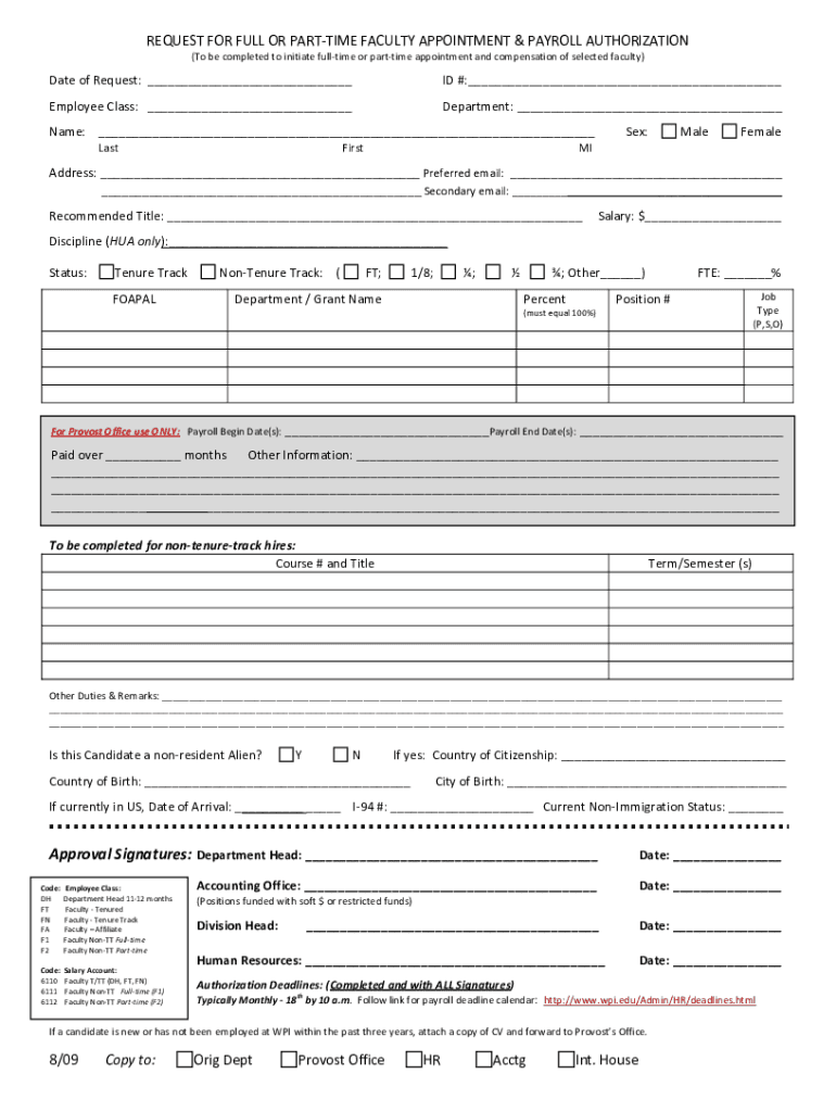 REQUEST FOR FULL OR PART TIME FACULTY APPOINTMENT & PAYROLL AUTHORIZATION (To be completed to initiate full time or part-time appointment and compensation of selected faculty)Date of Request: ID #: