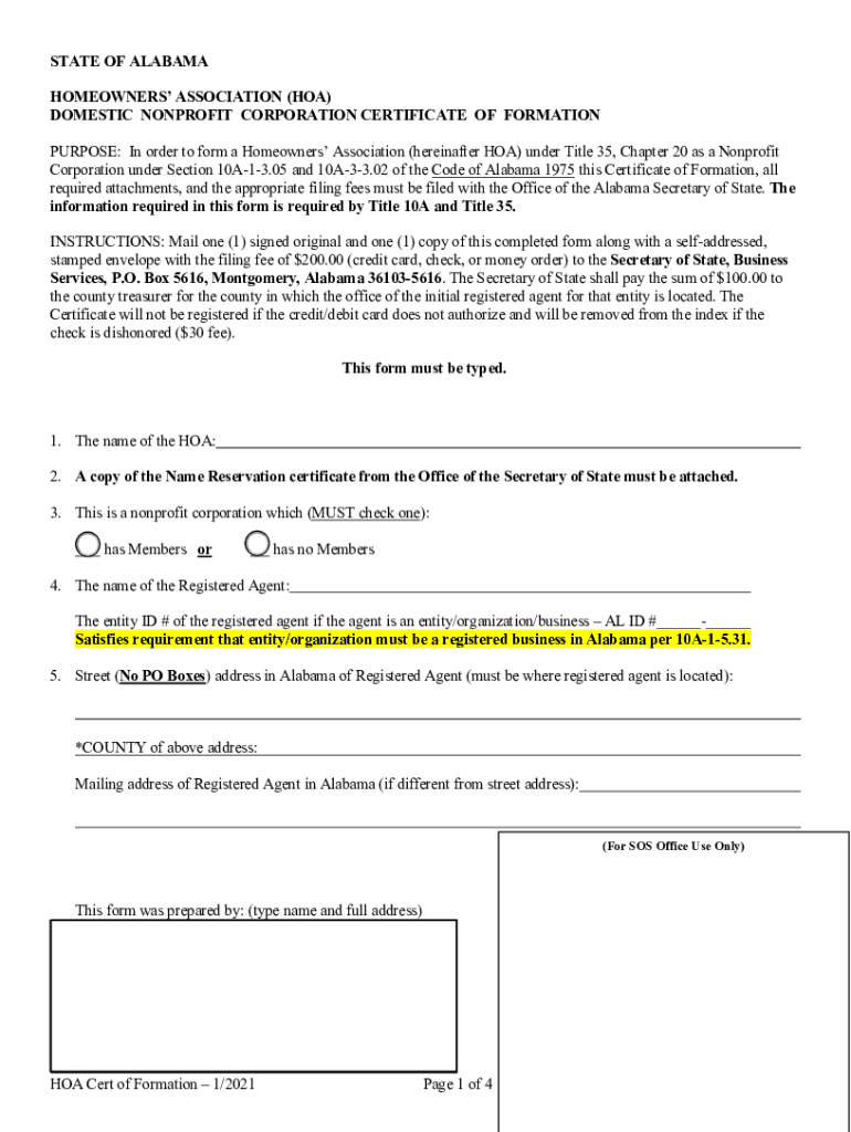 Get the free HOA Cert of Formation - Alabama Secretary of State