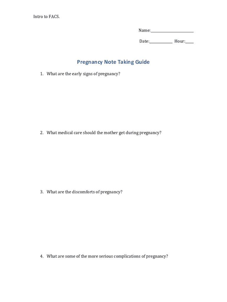 Intro to FACS. Name: Date: Hour: Pregnancy Note-Taking Guide1.2.3.4. What are the early signs of pregnancy? What medical care should the mother get during pregnancy? What are the discomforts of pregnancy?