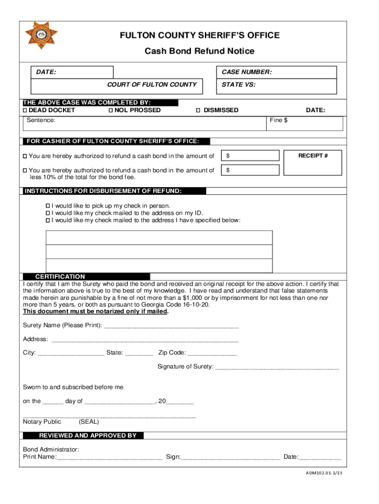 Get the free FULTON COUNTY SHERIFF'S OFFICE Cash Bond Refund Notice
