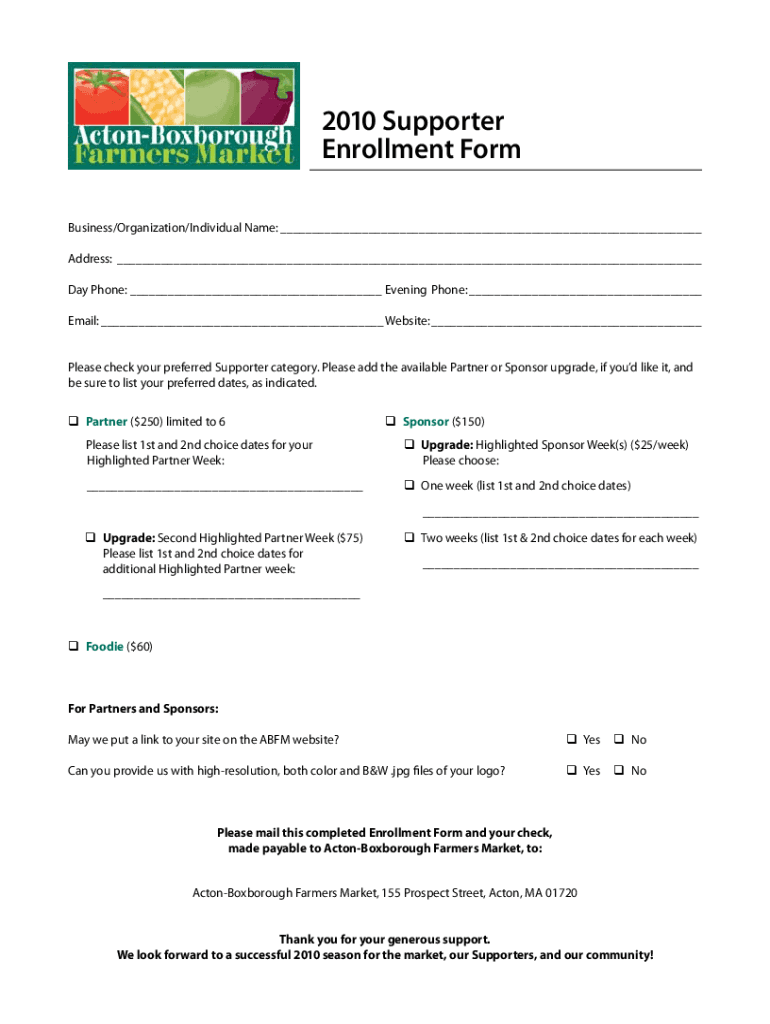 2010 Supporter Enrollment Form Business/Organization/Individual Name: Address: Day Phone: Evening Phone: Email: Website: Please check your preferred Supporter category. Please add the available Partner