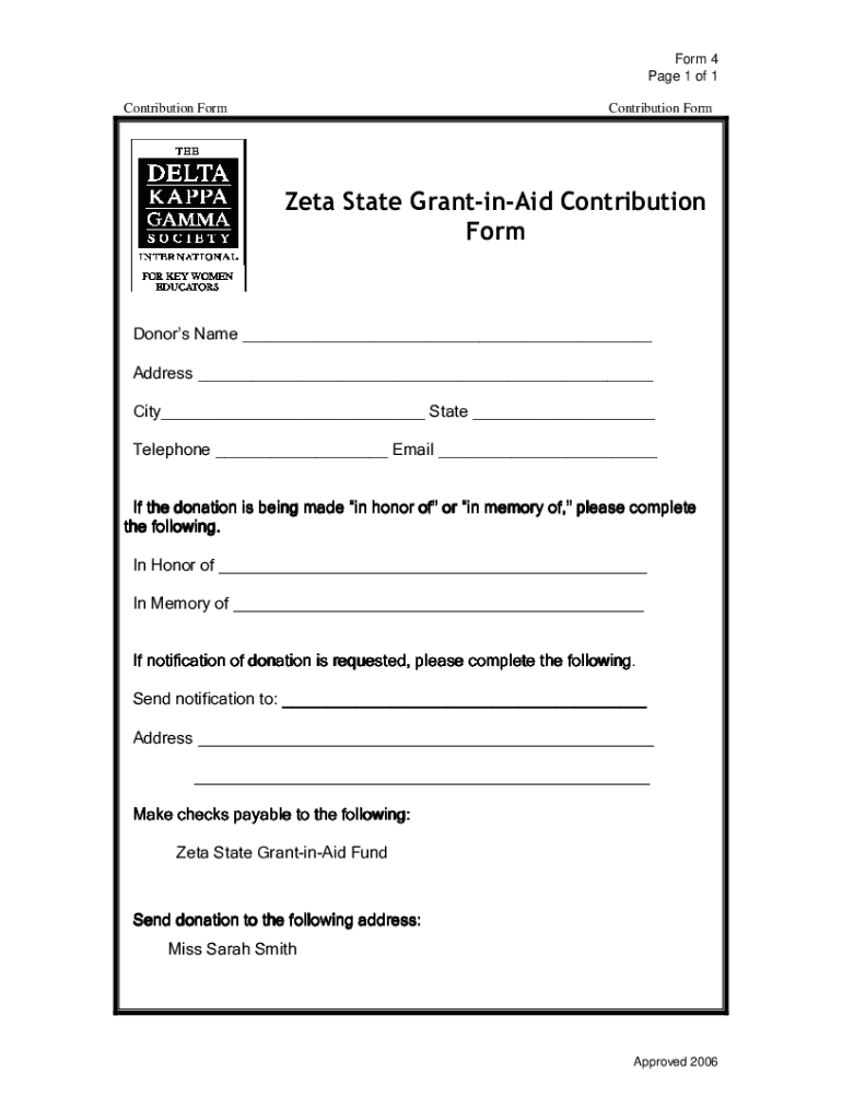 Form 4-Page 1 of 1 Contribution FormContribution Former State Granting Contribution Foredooms Name Address City State Telephone Email If the donation is being made in honor of or in memory of, of,