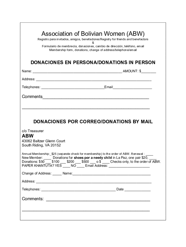 Association of Bolivian Women (ABW) Registry para invited, amigos, benefactors/Registry for friends and benefactors & Formulation DE member, donations, cam bio DE direction, Teflon, email Membership