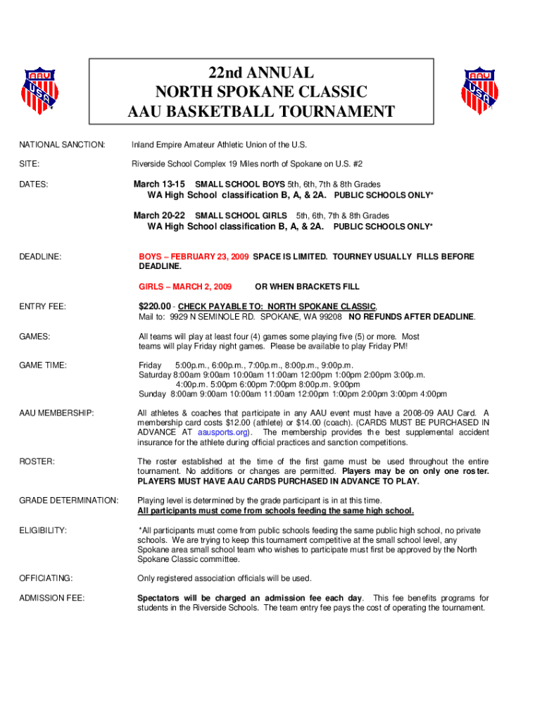 22nd ANNUAL NORTH SPOKANE CLASSIC AAU BASKETBALL TOURNAMENT NATIONAL SANCTION:Inland Empire Amateur Athletic Union of the U.S.SITE:Riverside School Complex 19 Miles north of Spokane on U.S. #2DATES:March