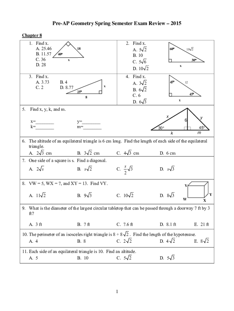 Prep Geometry Spring Semester Exam Review 2015 Chapter 8 1. Find x. A. 25.46 B. 11.57 C. 36 D. 28 3. Find x. A. 3.73 C. 22. Find x. A. 5 2 B. 10 C. 5 6 D. 10 218 40 lb. 4 D. 8.77 25 85.30 x4. Find