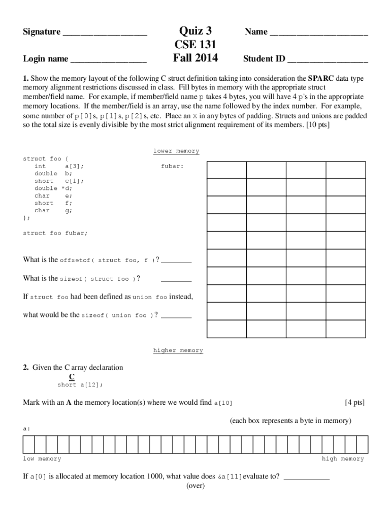 Signature Login name Quiz 3 CSE 131 Fall 2014Name Student ID 1. Show the memory layout of the following C struct definition taking into consideration the SPARC data type memory alignment restrictions