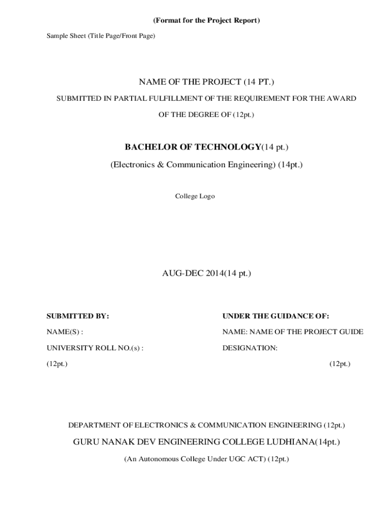 (Format for the Project Report) Sample Sheet (Title Page/Front Page)NAME OF THE PROJECT (14 PT.) SUBMITTED IN PARTIAL FULFILLMENT OF THE REQUIREMENT FOR THE AWARD OF THE DEGREE OF (12pt.)BACHELOR