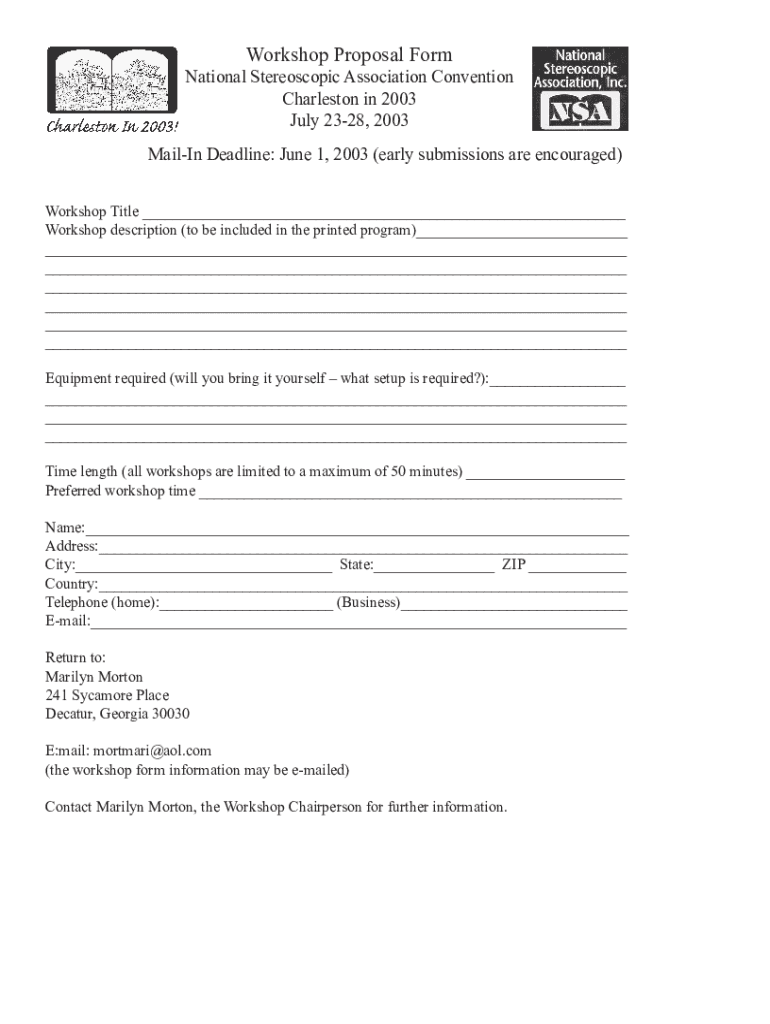 Workshop Proposal Formation Stereoscopic Association Convention Charleston in 2003 July 2328, 2003 Mailing Deadline: June 1, 2003 (early submissions are encouraged) Workshop Title Workshop description
