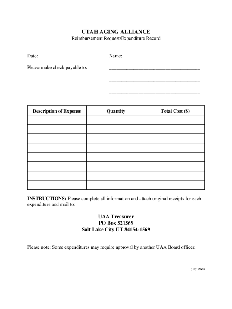 UTAH AGING ALLIANCE Reimbursement Request/Expenditure Decorate: Name: Please make check payable to: Description of ExpenseQuantityTotal Cost ($)INSTRUCTIONS: Please complete all information and attach