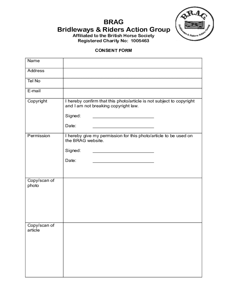 BRAG Bridleways & Riders Action Group Affiliated to the British Horse Society Registered Charity No: 1005463 CONSENT FORM Name Address Tel No Email CopyrightPermissionCopy/scan of photocopy/scan of