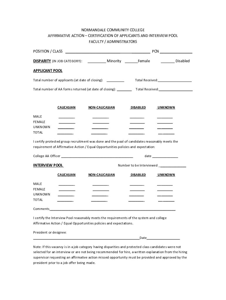 NORMANDY COMMUNITY COLLEGE AFFIRMATIVE ACTION CERTIFICATION OF APPLICANTS AND INTERVIEW POOL FACULTY / ADMINISTRATORS POSITION / CLASS DISPARITY (IN JOB CATEGORY): PCN MinorityFemaleDisabledAPPLICANT