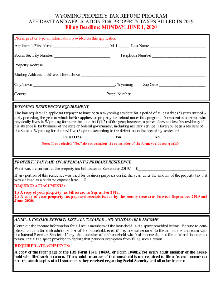 WYOMING PROPERTY TAX REFUND PROGRAM AFFIDAVIT AND APPLICATION FOR PROPERTY TAXES BILLED IN 2019 Filing Deadline: MONDAY, JUNE 1, 2020, Please print or type all information provided on this application.