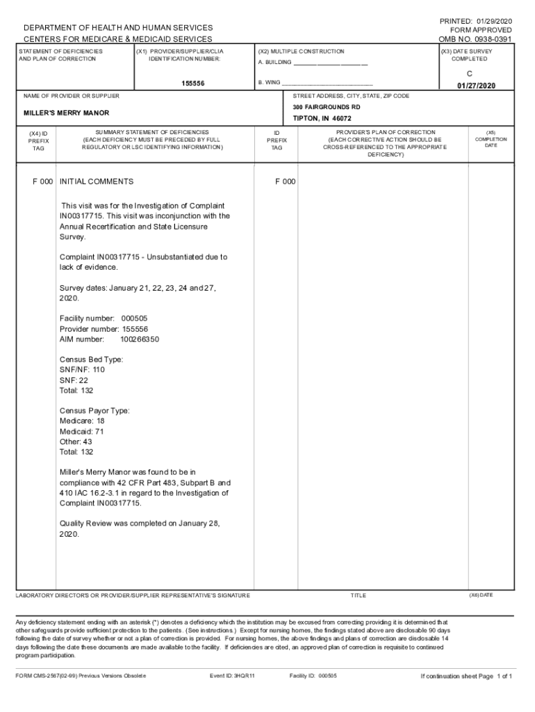 PRINTED: 01/29/2020 FORM APPROVEDDEPARTMENT OF HEALTH AND HUMAN SERVICES CENTERS FOR MEDICARE & MEDICAID SERVICES STATEMENT OF DEFICIENCIES AND PLAN OF CORRECTION(X1) PROVIDER/SUPPLIER/CIA IDENTIFICATION