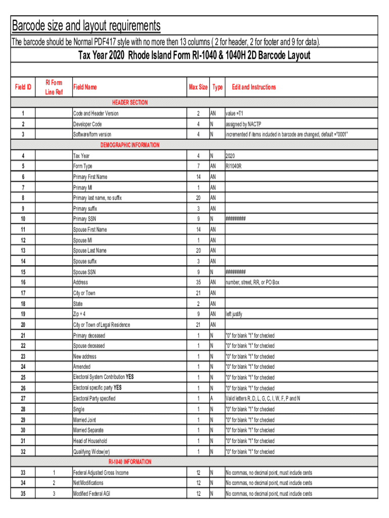 Barcode size and layout requirements The barcode should be Normal PDF417 style with no more than 13 columns (2 for header, 2 for footer and 9 for data). Tax Year 2020 Rhode Island Form RI1040 & 1040H