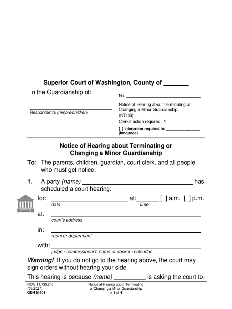 Superior Court of Washington, County of In the Guardianship of:No. Notice of Hearing about Terminating or Changing a Minor Guardianship (NTH) Clerks action required: 1Respondent/s (minors/children)