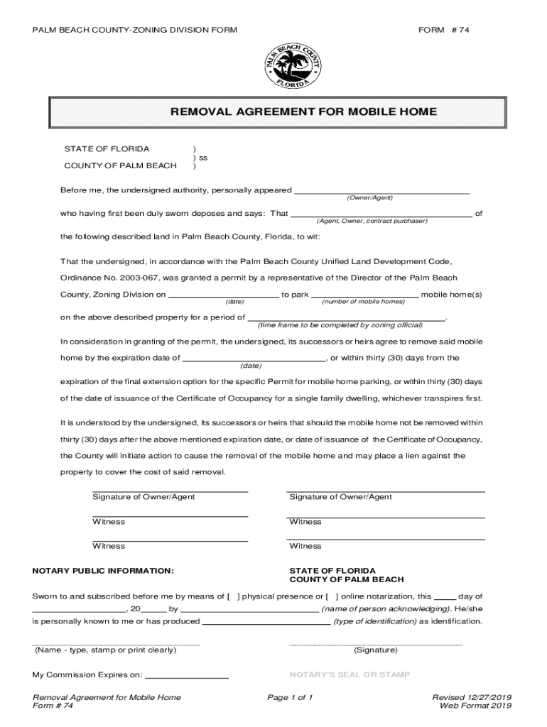PALM BEACH COUNTYZONING DIVISION FORMER # 74REMOVAL AGREEMENT FOR MOBILE HOMESTAY OF FLORIDA