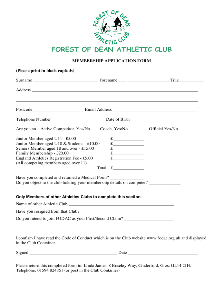 FOREST OF DEAN ATHLETIC CLUB MEMBERSHIP APPLICATION FORM (Please print in block capitals) Surname Forename Title Address Postcode Email Address Telephone Number Date of Birth Are you inactive Competitor