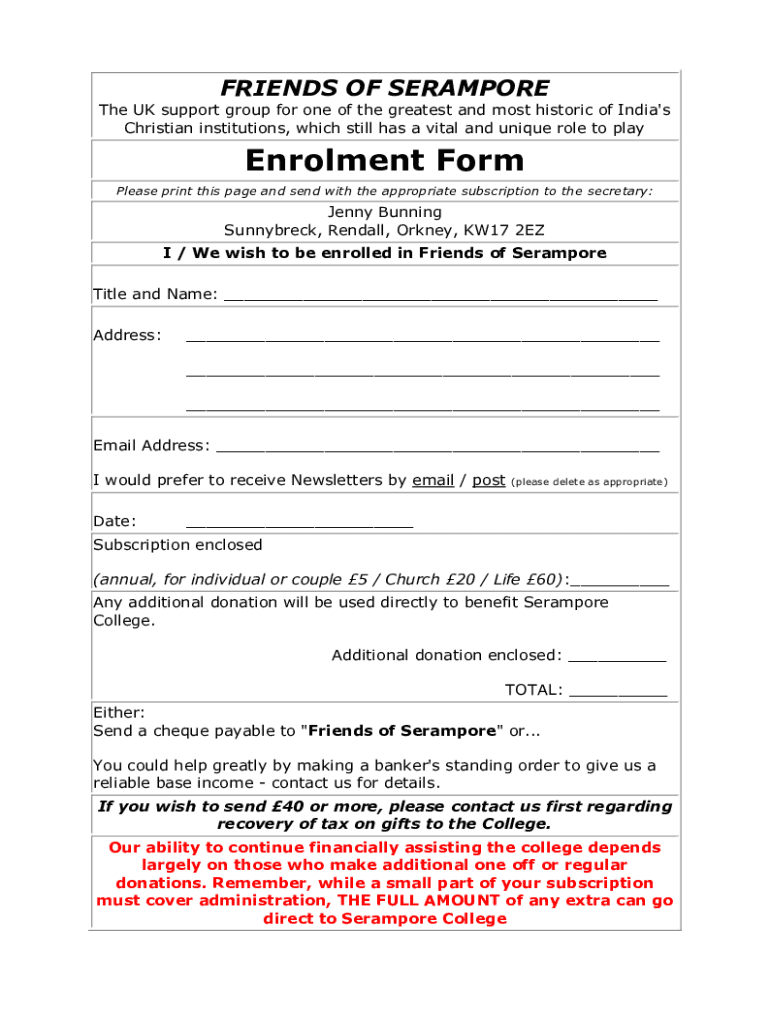 FRIENDS OF SERAMPOREThe UK support group for one of the greatest and most historic of India's Christian institutions, which still has a vital and unique role to playEnrolment Form Please print this