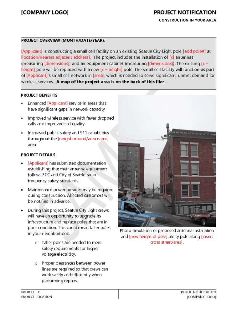 COMPANY LOGO PROJECT NOTIFICATION CONSTRUCTION IN YOUR AREAPROJECT OVERVIEW (MONTH/DATE/YEAR): Applicant is constructing a small cell facility on an existing Seattle City Light pole add pole# at location/the
