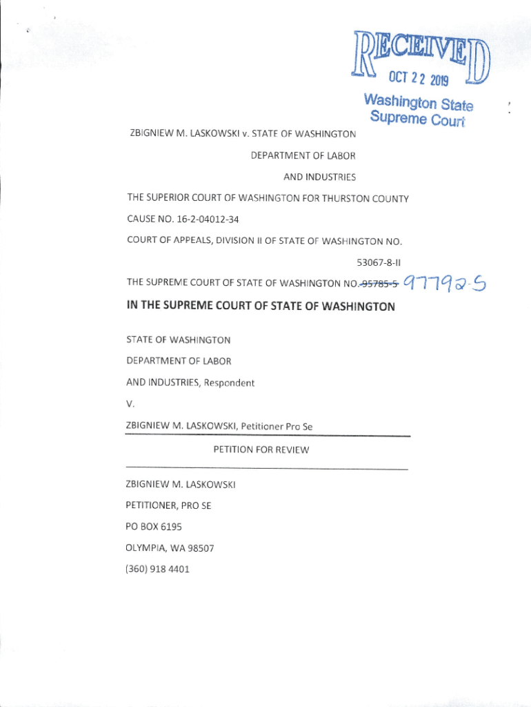 'OK OCR 2 2 2019Washington State Supreme Court BIGGIE M. MINKOWSKI v. STATE OF WASHINGTON DEPARTMENT OF LABOR AND INDUSTRIES SUPERIOR COURT OF WASHINGTON FOR THURSTON COUNTY CAUSE NO. 1620401234COURT