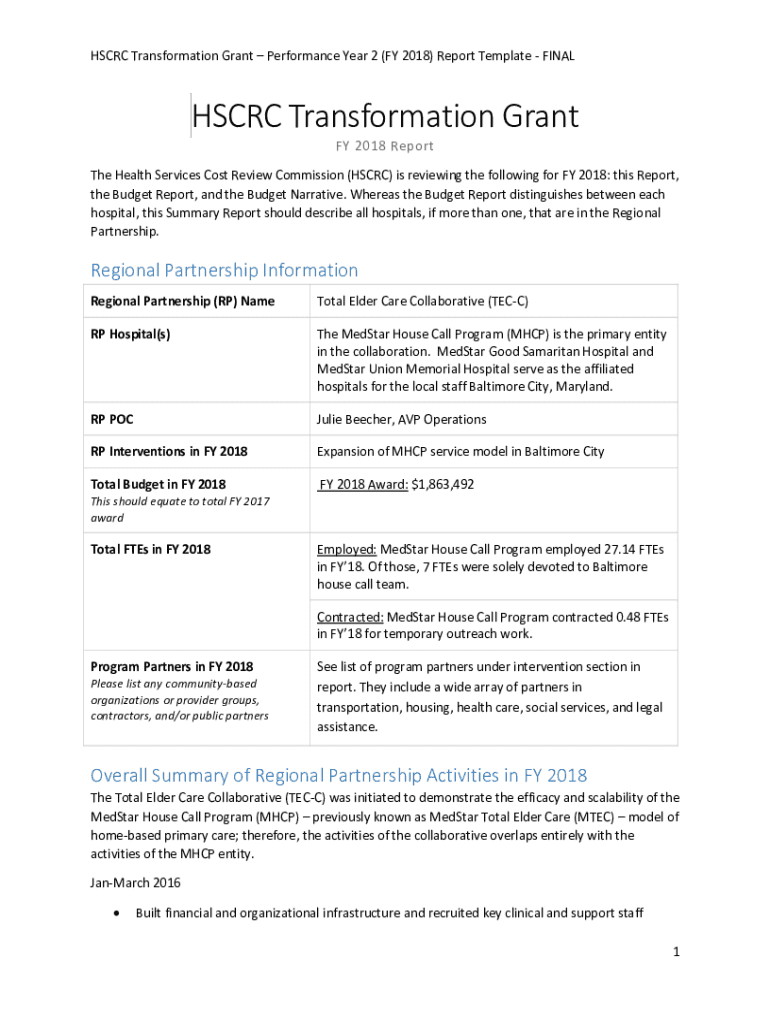 HS CRC Transformation Grant Performance Year 2 (FY 2018) Report Template FINALHSCRC Transformation Grant FY 2018 Report The Health Services Cost Review Commission (HS CRC) is reviewing the following