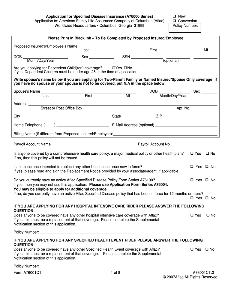 Any employee wishing to apply for specified disease insurance coverage through Aflac can fill out this form. Additionally, Aflac associates or agents may assist in the process.