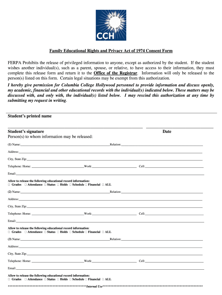 Students currently enrolled at Columbia College Hollywood are eligible to sign the FERPA Consent Form, granting access to their educational records. Consent from the student is necessary for the release of information.