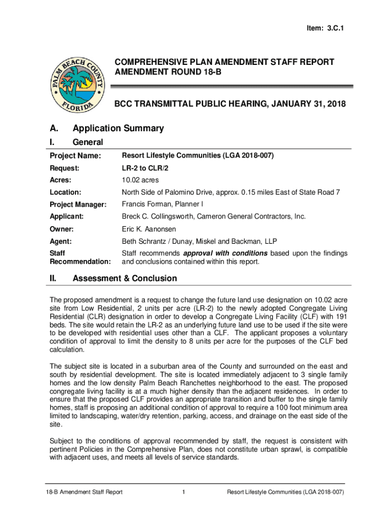AMENDMENT ROUND 18BBCC TRANSMITTAL PUBLIC HEARING, JANUARY 31, 2018A. Application Summary. GeneralProject Name:Resort Lifestyle Communities (LGA