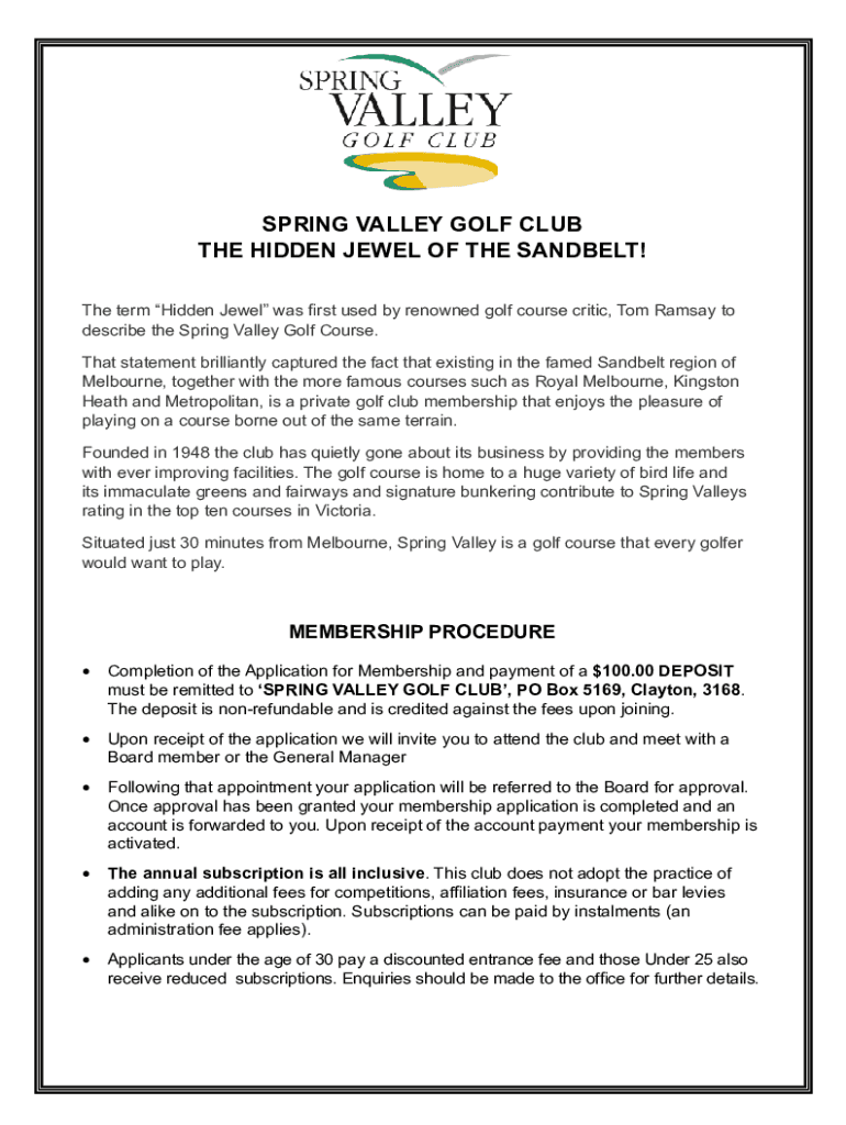 To fill out the application for Spring Valley Golf Club, individuals should visit the club's official website to obtain the appropriate form, providing all necessary personal information, payment details, and any required documents.