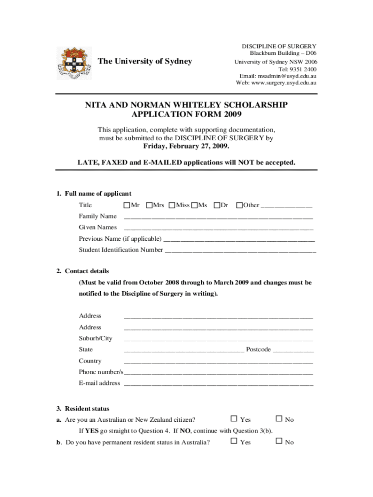 DISCIPLINE OF SURGERY Blackburn Building D06The University of SydneyUniversity of Sydney NSW 2006 Tel: 9351 2400 Email: ms admin used.edu.AU Web: www.surgery.usyd.edu.auNITA AND NORMAN WHITELEY SCHOLARSHIP