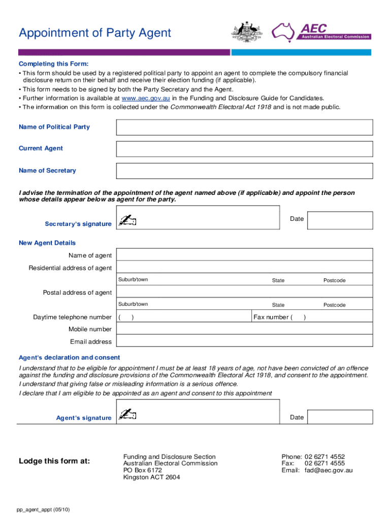 Appointment of Party Agent Completing this Form: This form should be used by a registered political party to appoint an agent to complete the compulsory financial disclosure return on their behalf