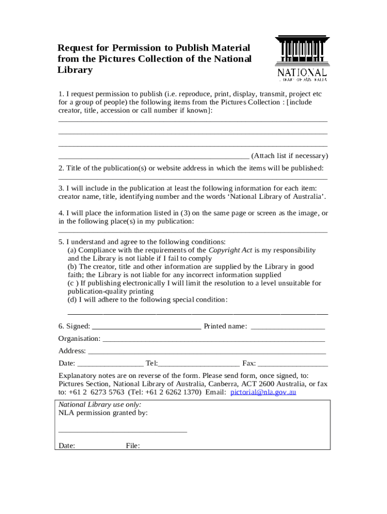 Request for Permission to Publish Material from the Pictures Collection of the National Library template instructions