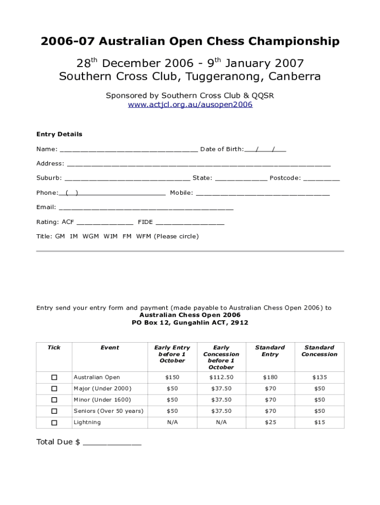 200607 Australian Open Chess Championship 28th December 2006 9th January 2007 Southern Cross Club, Tuggeranong, Canberra Sponsored by Southern Cross Club & QSR www.actjcl.org.au/ausopen2006Entry Details