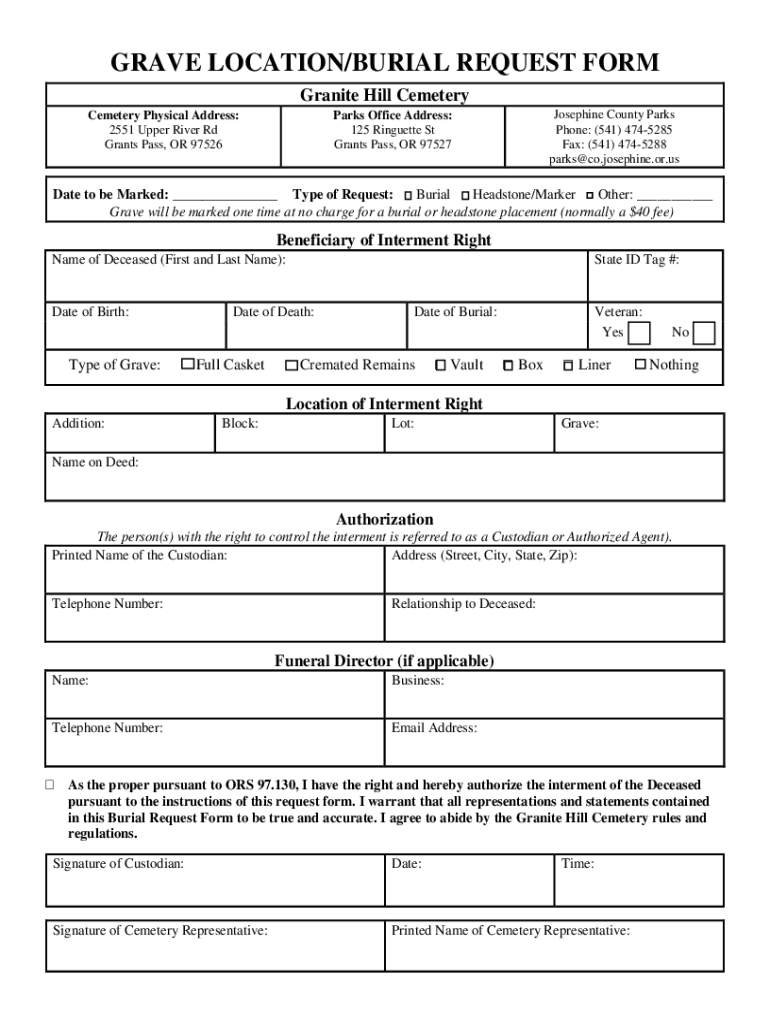 GRAVE LOCATION/BURIAL REQUEST FORM Granite Hill Cemetery Physical Address: 2551 Upper River Rd Grants Pass, OR 97526Parks Office Address: 125 Ringette St Grants Pass, OR 97527Josephine County Parks