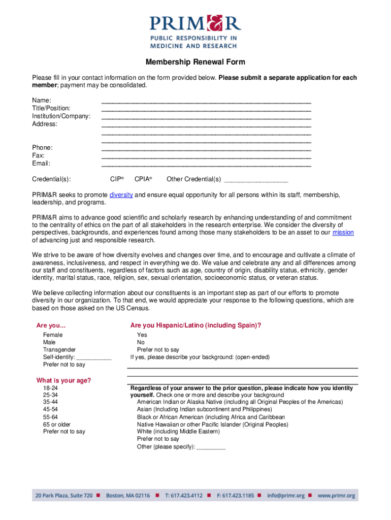 Membership Renewal Form Please fill in your contact information on the form provided below. Please submit a separate application for each member; payment may be consolidated. Name: Title/Position: