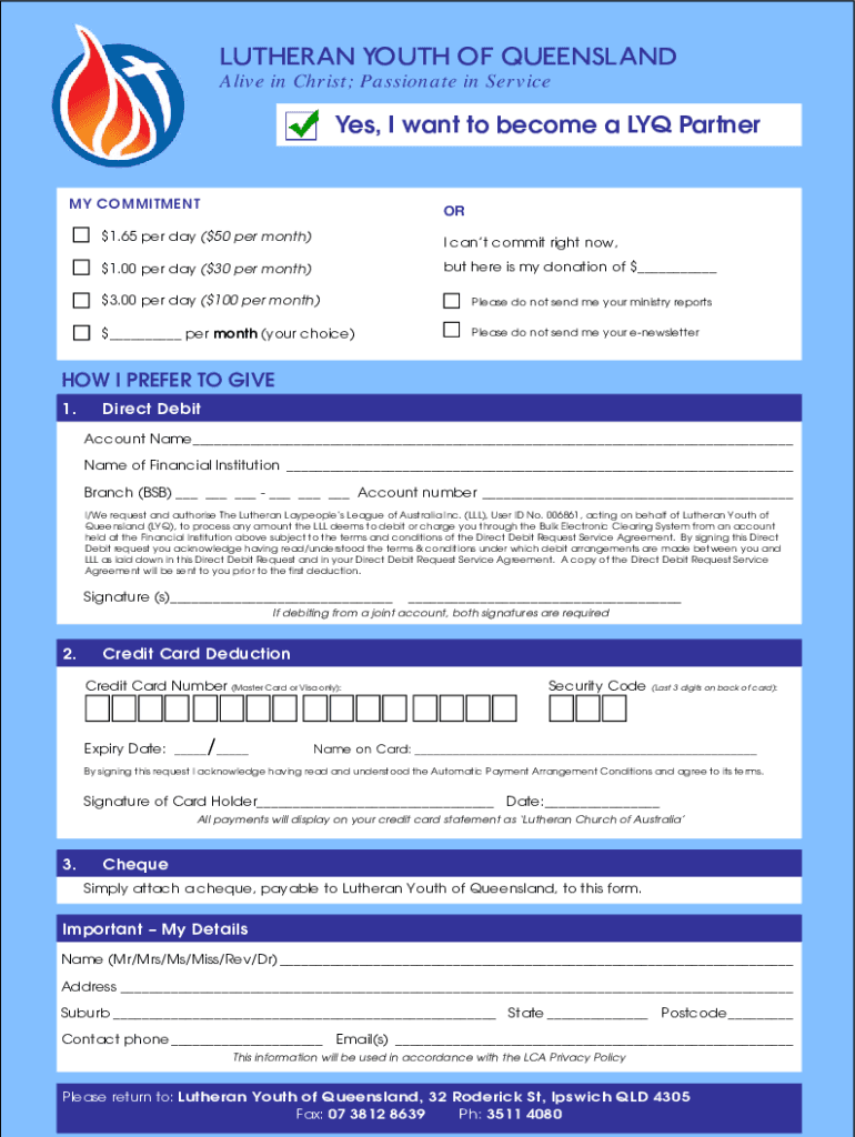 LUTHERAN YOUTH OF QUEENSLAND Alive in Christ; Passionate in Services, I want to become a LYE Partner MY COMMITMENTOR$1.65 per day ($50 per month)I can't commit right now,$1.00 per day ($30 per month)but